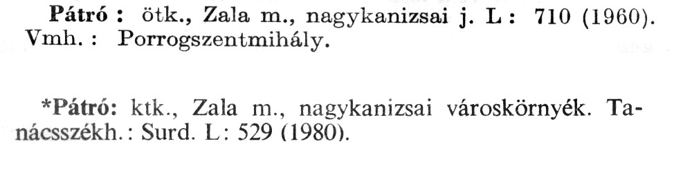 Nyilvános 2027 | 6091 | A szócikkek felismertetett szövege: | (A csillag után az 1981-es kiadású kiegészítő kötetből származó szöveg következik) Pátró: ötk., Zala m., nagykanizsai j. L : 710 (1960). Vmh.: Porrogszentmihály. *Pátró: ktk., Zala m., nagykanizsai városkörnyék. Tanácsszékh.: Surd. L: 529 (1980). A szócikkek a következő lexikonból származnak: Cím: Új magyar lexikon Közreműködő: Berei Andor (1900-1979) (szerk.) Szerz. közl.: [szerk. Berei Andor et al.] Kiadás jelzés: 2. lny. Kiadás: Budapest : Akad. K., 1961-1962 Kötetei: 1., A - C 2., D - F 3., G - J 4., K - Me 5., Mf - R 6., S - Z 7. köt., A-Z Kiegészítő kötet (1972) Kiegészítő kötet, 1962÷1980 (1981) ETO jelzet: 03=945.11 Szakjelzet: 030 Cutter: U 28 Nyelv: magyar Megjegyzés: Bibliogr. a címszavak egy részének végén |